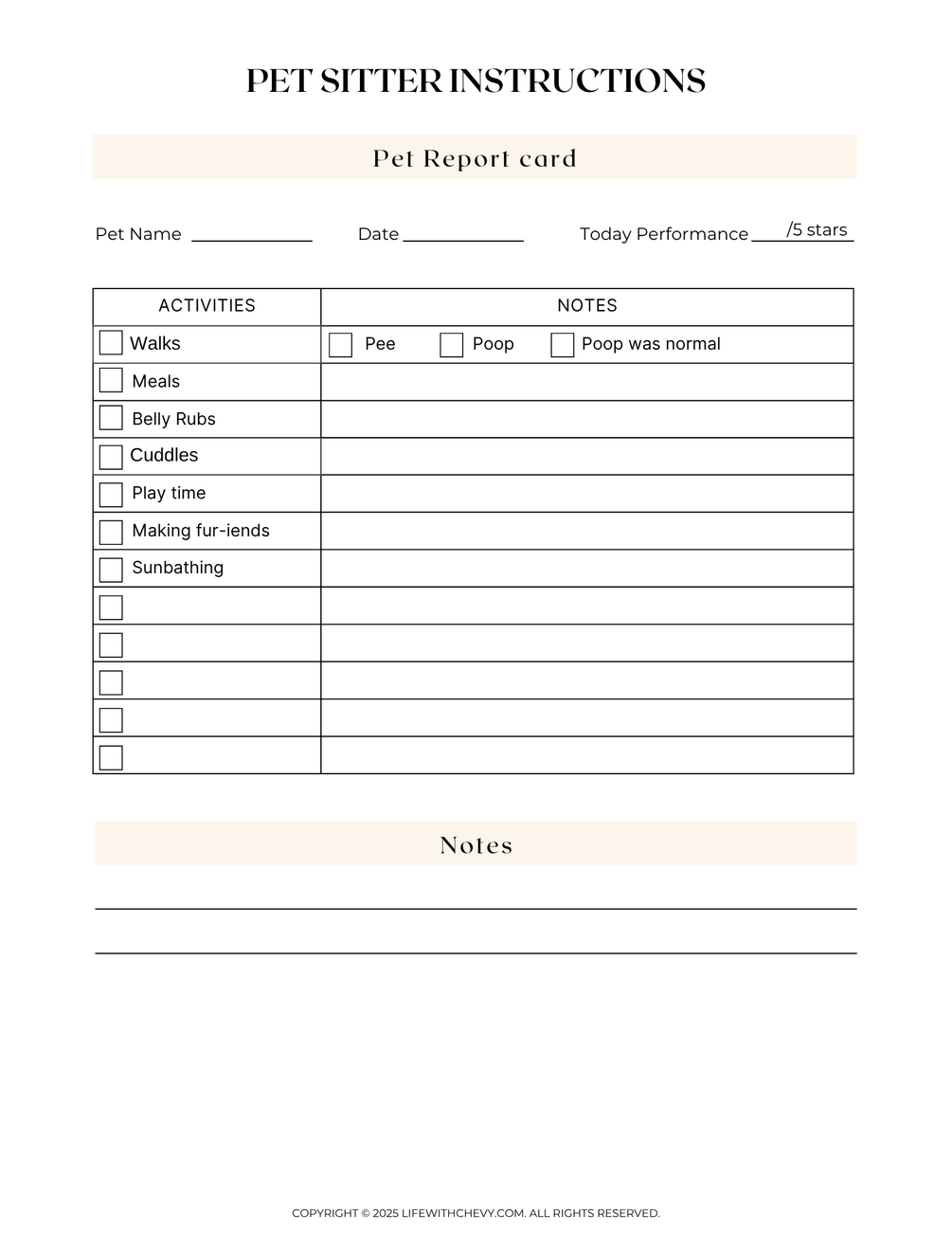 - Page 3: Pet Report Card (genius idea from my dog walker!)